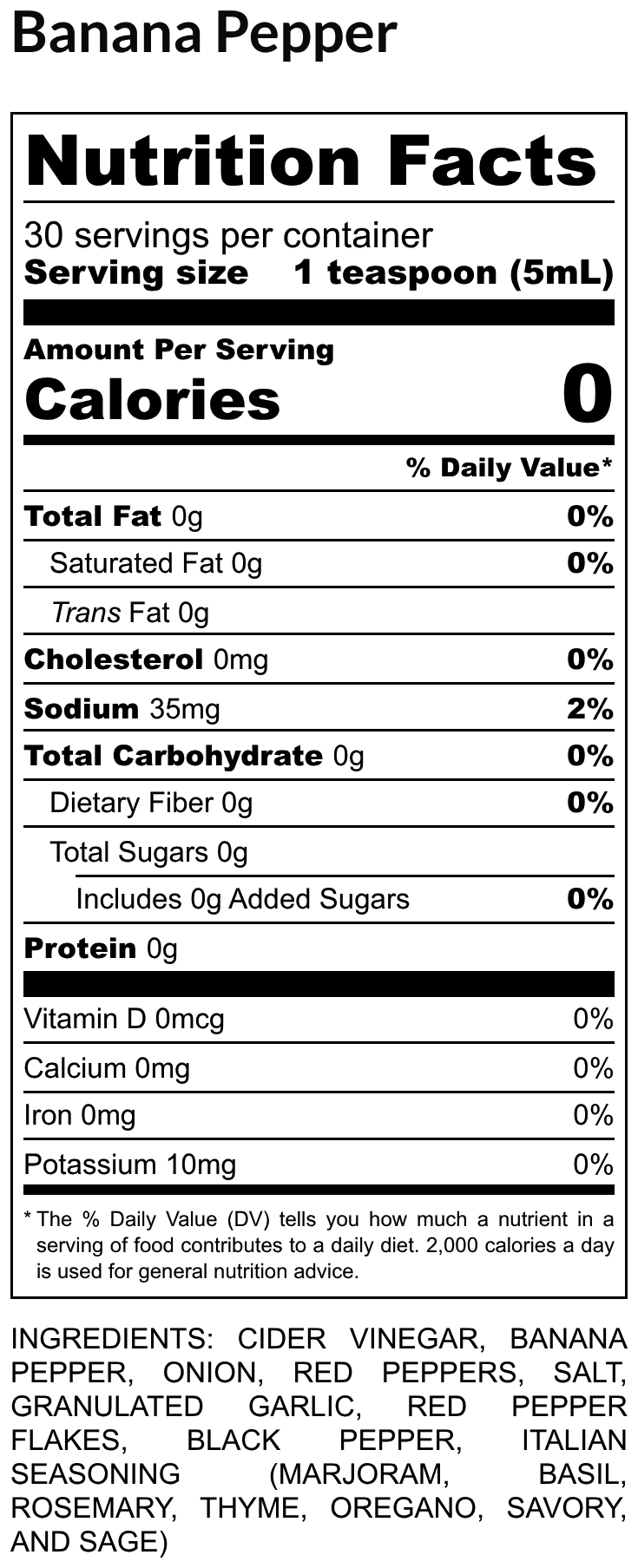 Ingredients: Apple Cider Vinegar, Banana Peppers, Onions, Bell Pepper, Salt, Granulated Garlic, Red Pepper Flakes, Black Pepper, Italian Seasoning (Marjoram, Thyme, Rosemary, Savory, Sage, Oregano, Basil)